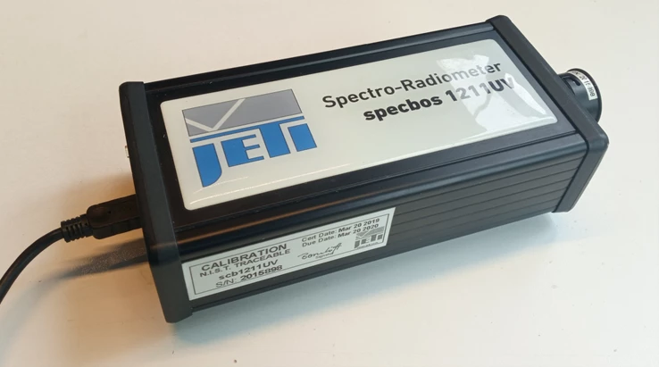Das UV-Spektralphotometer JETI Specbos 1211 der Jenaer Technische Instrumente GmbH analysiert spektrale Strahldichteverteilungen von Lichtquellen und Leuchten im Wellenlängenbereich von 350 - 1.000 nm mit einer Auflösung von 1 nm.