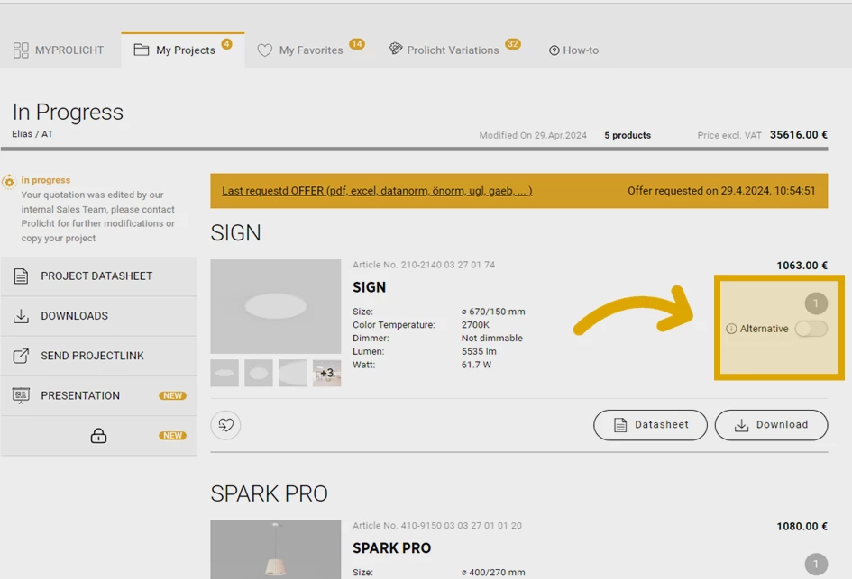 We have the possibility to mark alternative positions, already in MYPROLICHT. Alternative Positions will be excluded from the Project Price and are a great tool to show different options already in MYPROLICHT.