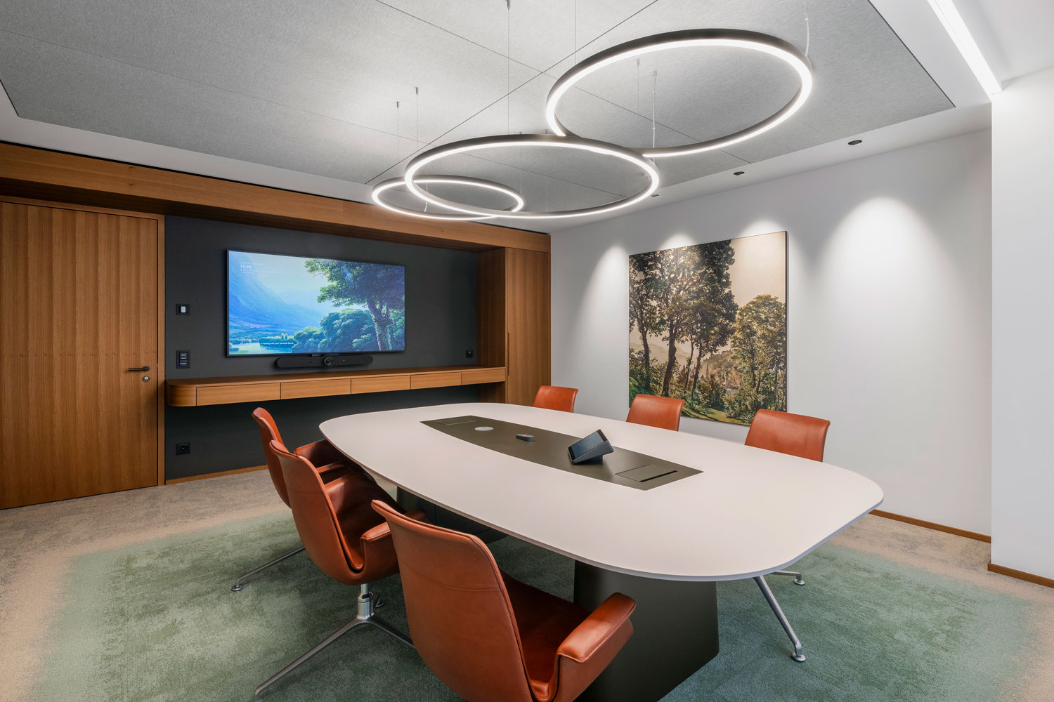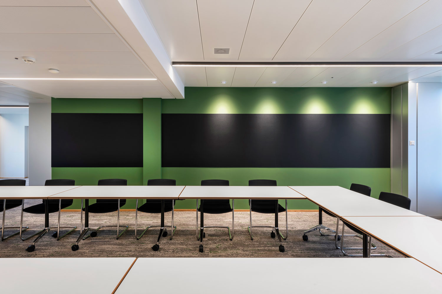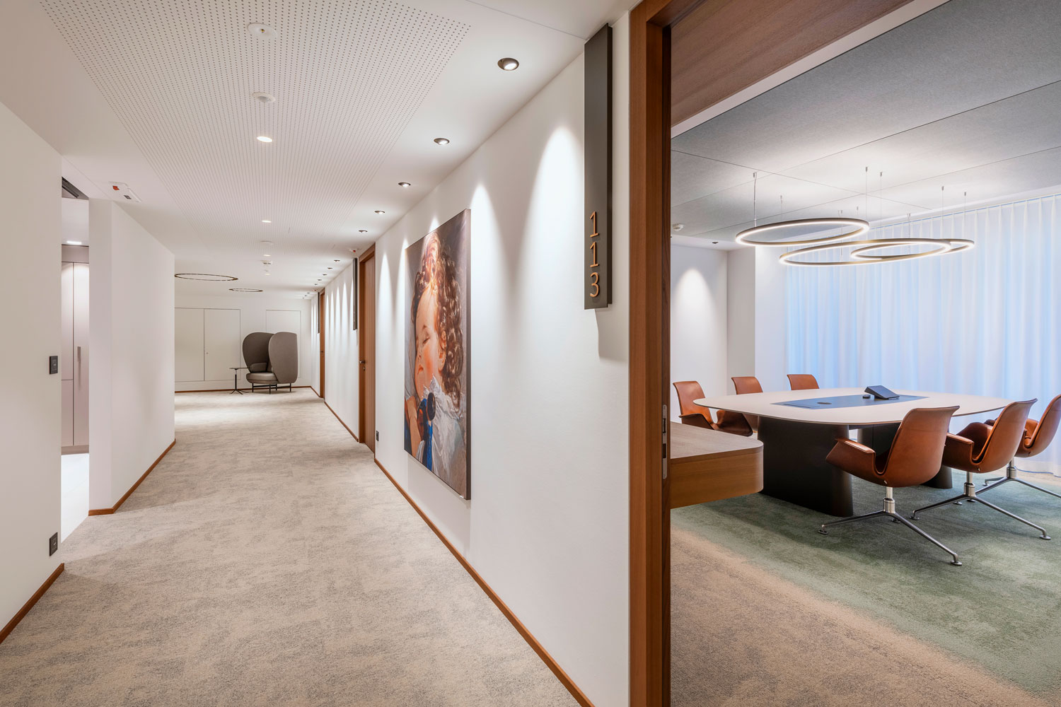 OIKO PRO Adjustable recessed luminaires were used in various rooms for targeted wall illumination. In open customer areas such as the entrance and lounge, GLORIOUS SLIM recessed luminaires were integrated as a project-specific custom solution with INVADER inserts. In the meeting rooms, GLORIOUS SLIM pendant luminaires provide uniform illumination and create a calm, harmonious atmosphere. The luminaires meet the functional requirements of the respective spaces and integrate precisely into the architectural design.