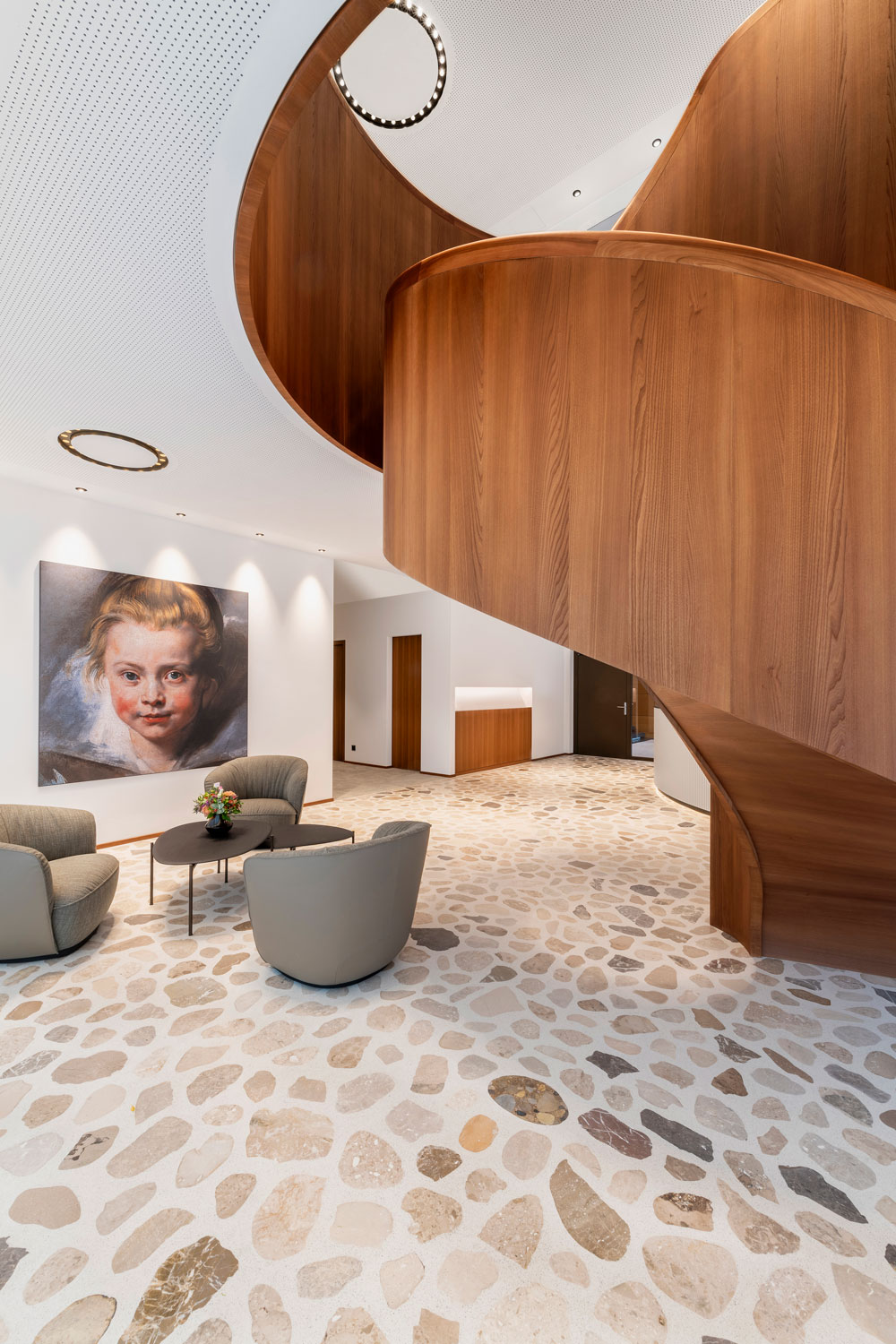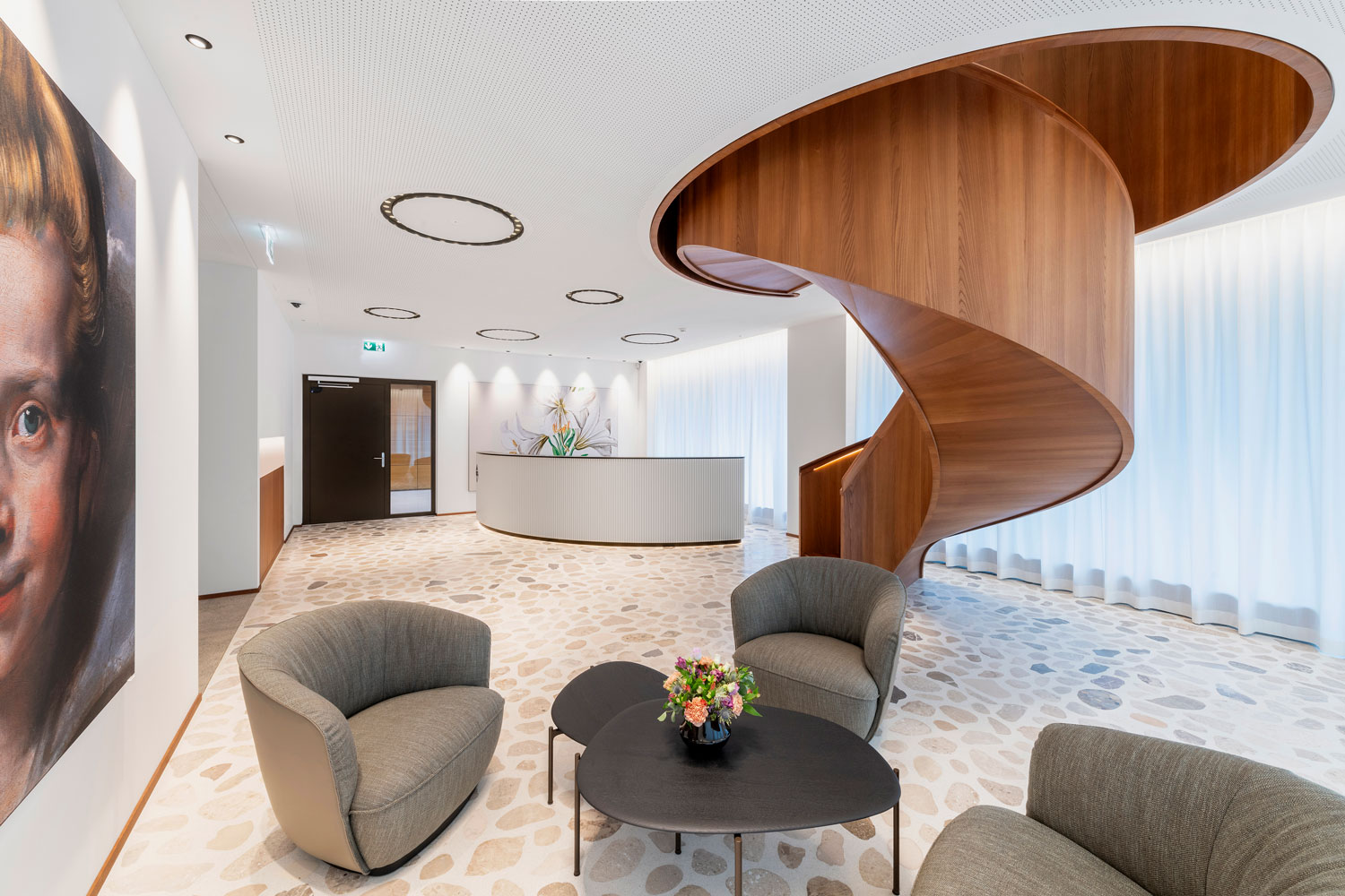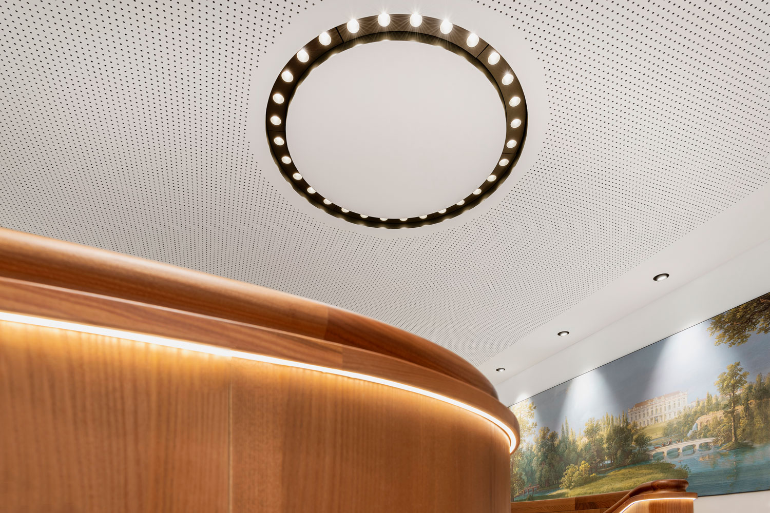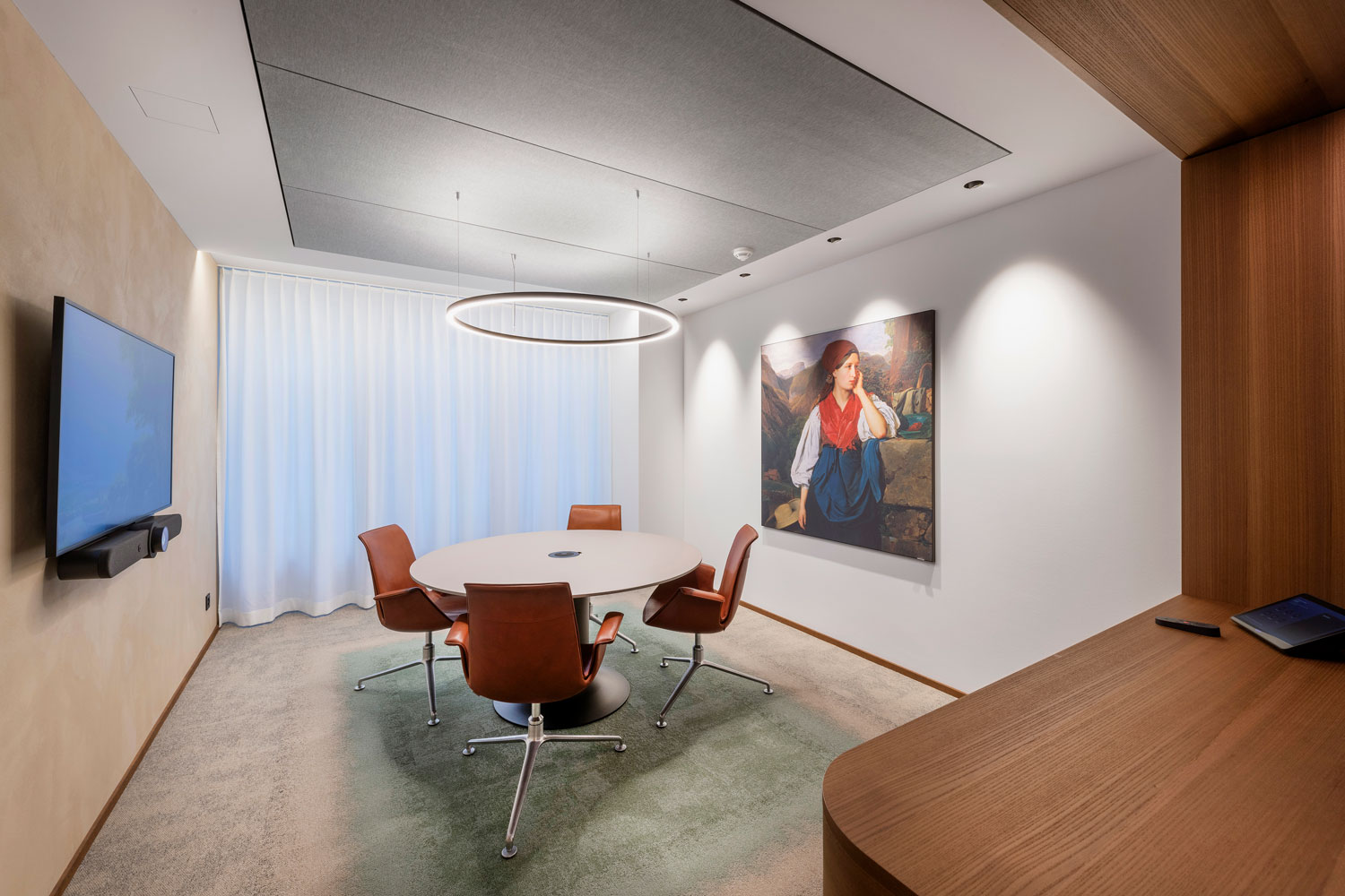 OIKO PRO Adjustable recessed luminaires were used in various rooms for targeted wall illumination. In open customer areas such as the entrance and lounge, GLORIOUS SLIM recessed luminaires were integrated as a project-specific custom solution with INVADER inserts. In the meeting rooms, GLORIOUS SLIM pendant luminaires provide uniform illumination and create a calm, harmonious atmosphere. The luminaires meet the functional requirements of the respective spaces and integrate precisely into the architectural design.